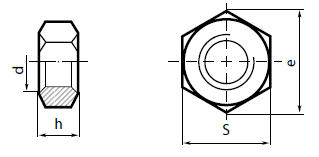 | d - номинальный диаметр резьбы, мм | h - высота гайки, мм | S - размер под ключ, мм | e - диаметр описанной окружности, не менее, мм | Шаг резьбы, мм | Масса 1000 шт., кг | Кол-во шт. в кг. |